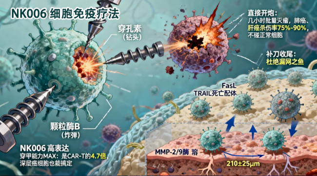 实体瘤的 “堡垒” 又厚又硬,里面还有耐药细胞 “负隅顽抗”,NK006 用双重路径实现 “精准爆破”。