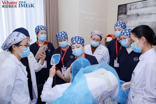 下午的爱美客战略品项联合治疗实操研修环节中,两位特邀专家亲自带教,围绕宝尼达与惟她天使的联合治疗方案进行线下实操演示。从面部解剖到进针层次,从剂量把控到美学设计,每一个细节都在实操中得以深化。这不仅是一场个性的精细化治疗技术的传承,更是一次对“医美回归医疗本质”的生动践行。